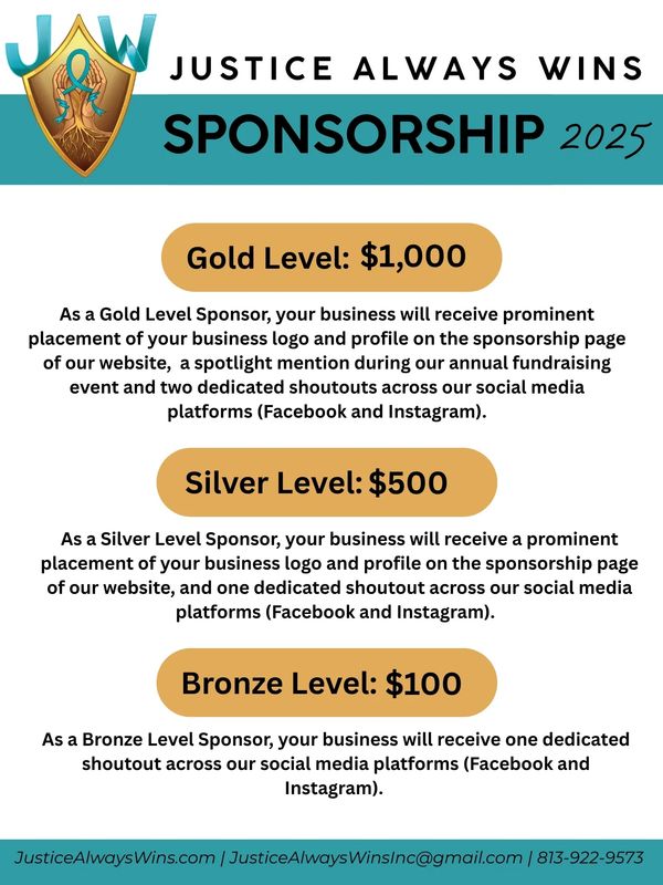 Become a sponsor today by emailing us at JusticeAlwaysWinsInc@gmail.com